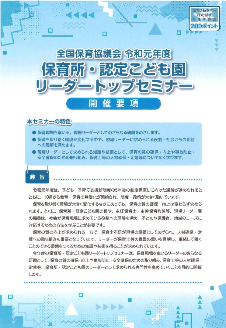 全国保育協議会 保育所・認定こども園リーダートップセミナーにて講師を務めます。 【日程】 令和2年2月24日(月・祝)~25日(火) 【会場】 新横浜プリンスホテル -