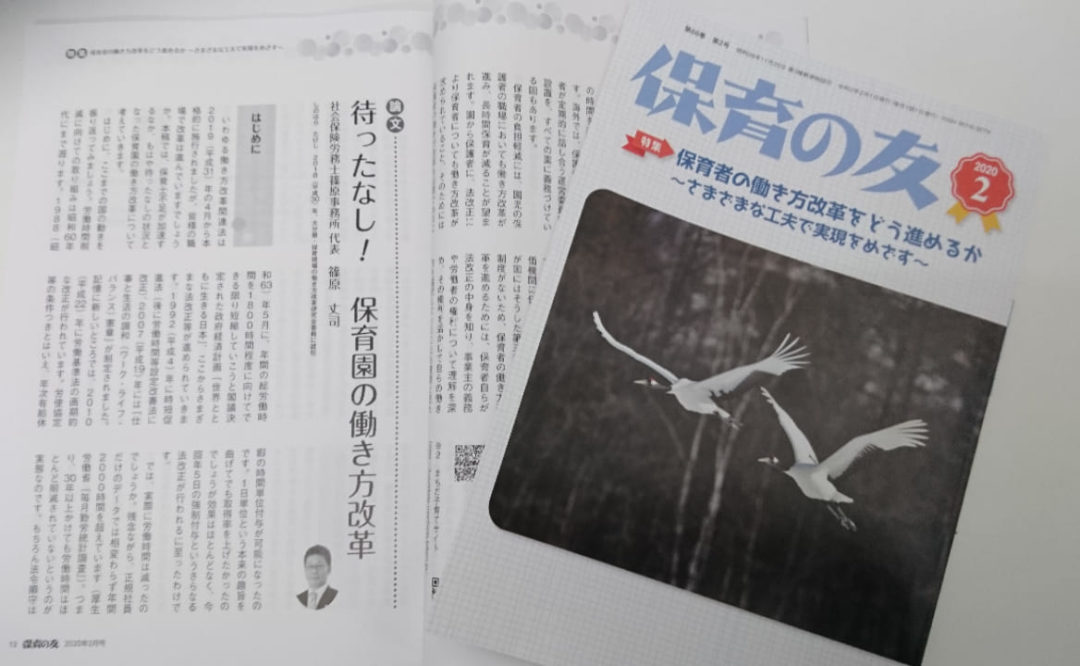 2020年2月1日 全国社会福祉協議会発行の「保育の友 2月号」に保育現場の働き方改革についての原稿が掲載されました。 タイトルは「待った無し!保育園の働き方改革」です