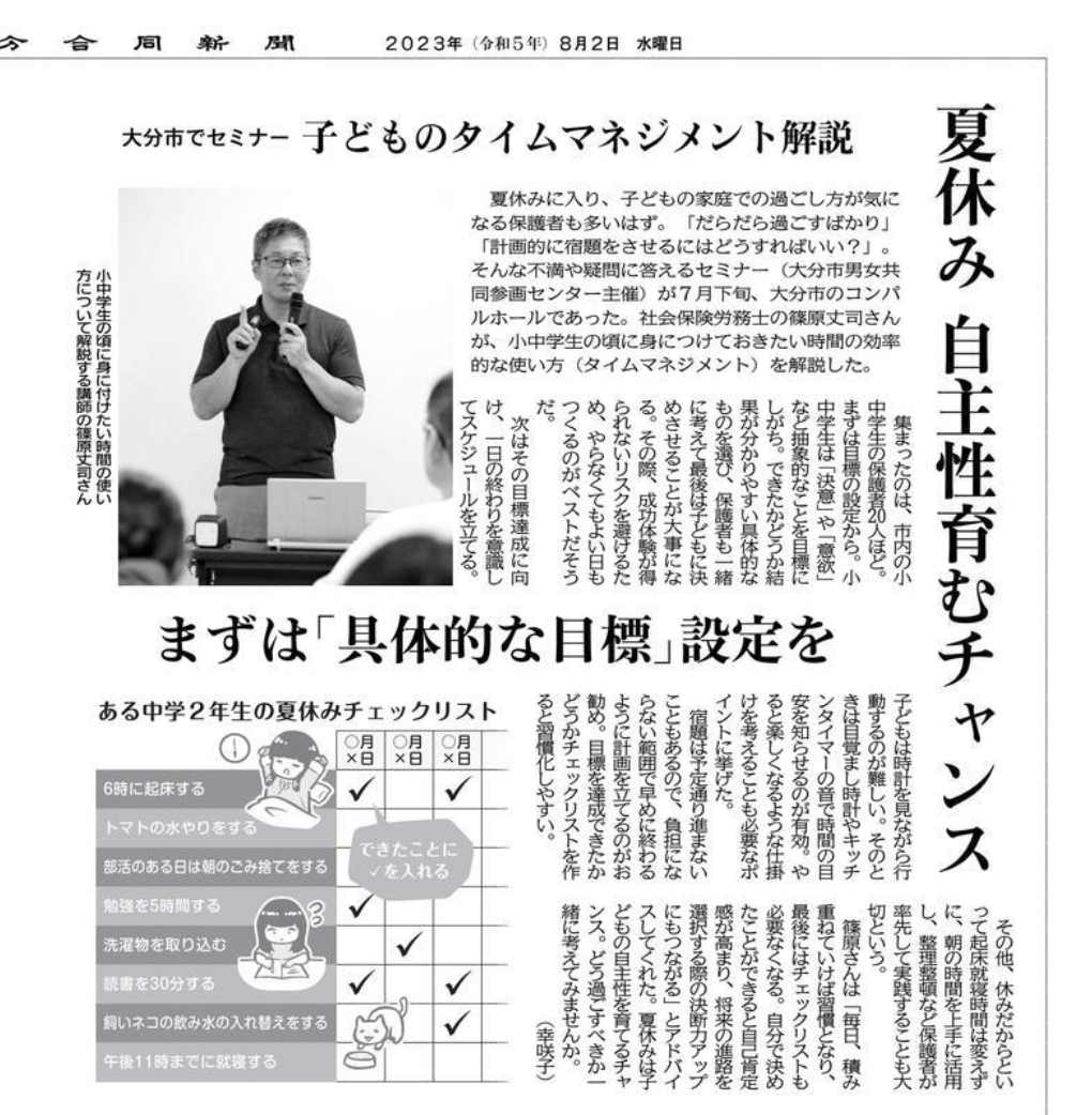 2023年8月2日の大分合同新聞に 小中学生の保護者を対象とした 「子ども向けタイムマネジメントセミナー」 の様子が紹介されました。※掲載許諾済 -