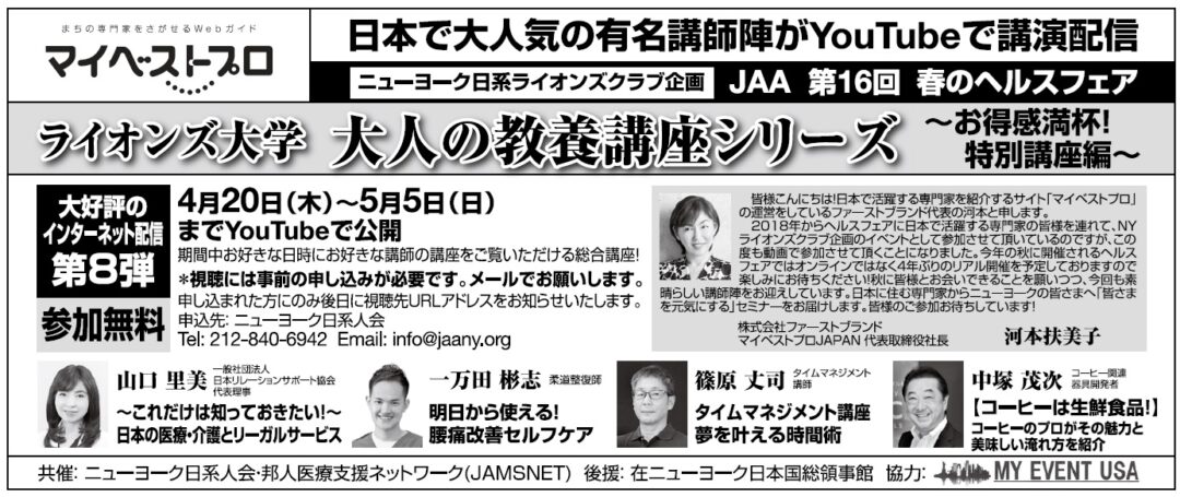 ニューヨーク日系人会(JAA)と邦人医療支援ネットワーク(JAMSNET)の共催で開催された春のヘルスフェア(後援:在ニューヨーク日本国総領事館、米国日本人医師会)においてタイムマネジメント講座「夢を叶える時間術」の動画が紹介されました。 -