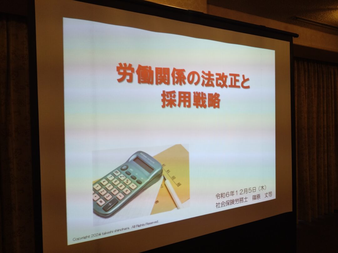 2024年12月5日 「労働関係の法改正と採用戦略」 主催:大分県中小企業団体中央会 場所:センチュリーホテル 法改正情報とその対策、そしてこれからの採用戦略について解説しました。 -