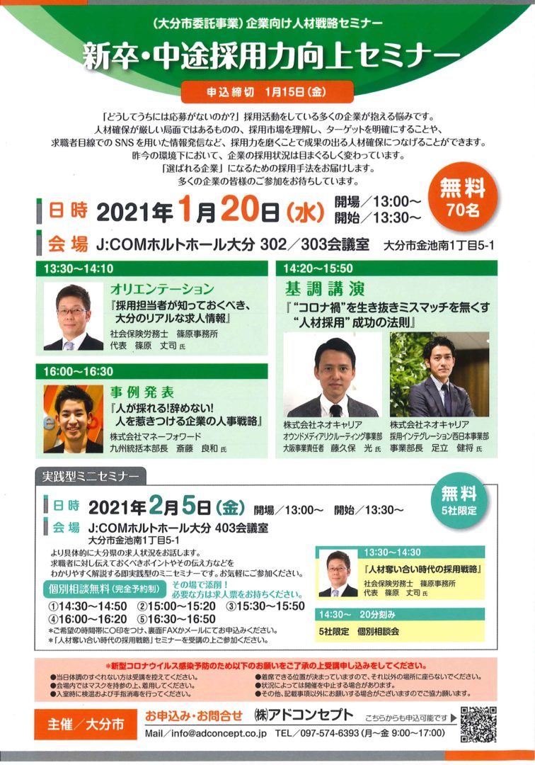 2021年1月20日 「新卒・中途採用力向上セミナー」に登壇しました。 主催:株式会社アドコンセプト(大分市委託事業) 場所:オンライン -