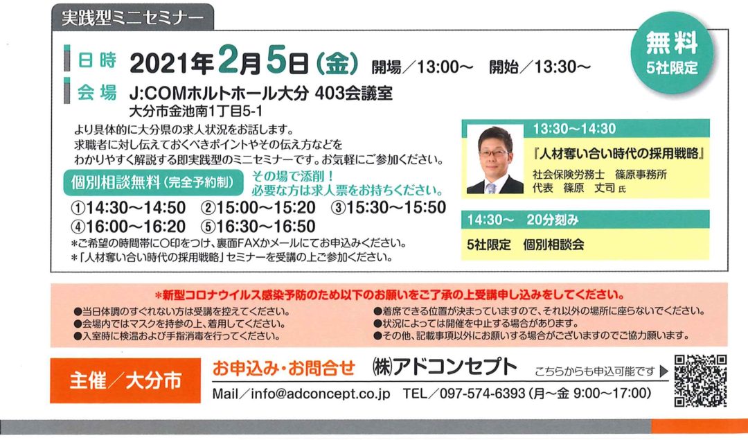 2021年2月5日 「人材奪い合い時代の採用戦略」に登壇しました。 主催:株式会社アドコンセプト(大分市委託事業) 場所:ホルトホール大分 -